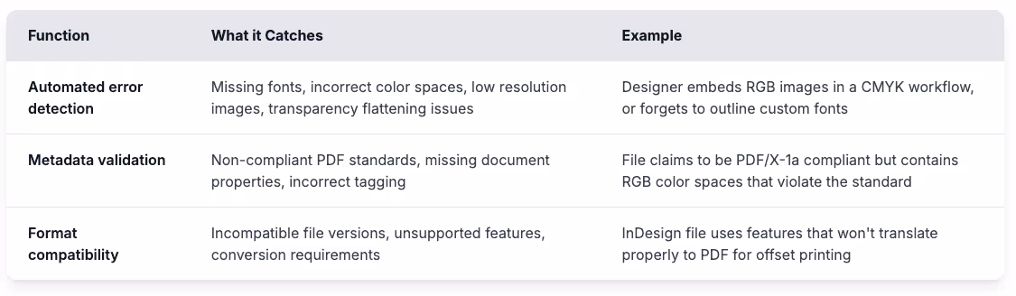 Preflight software scans digital files against defined quality standards before production begins. The three core functions work together to catch technical issues that would otherwise cause production failures:
