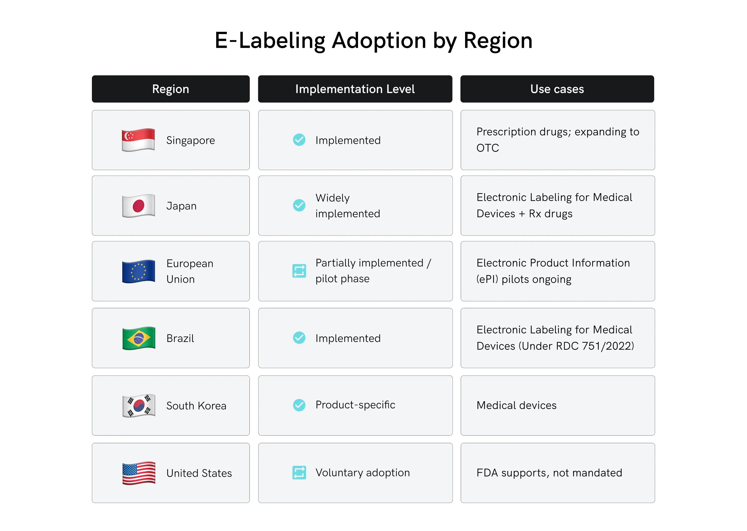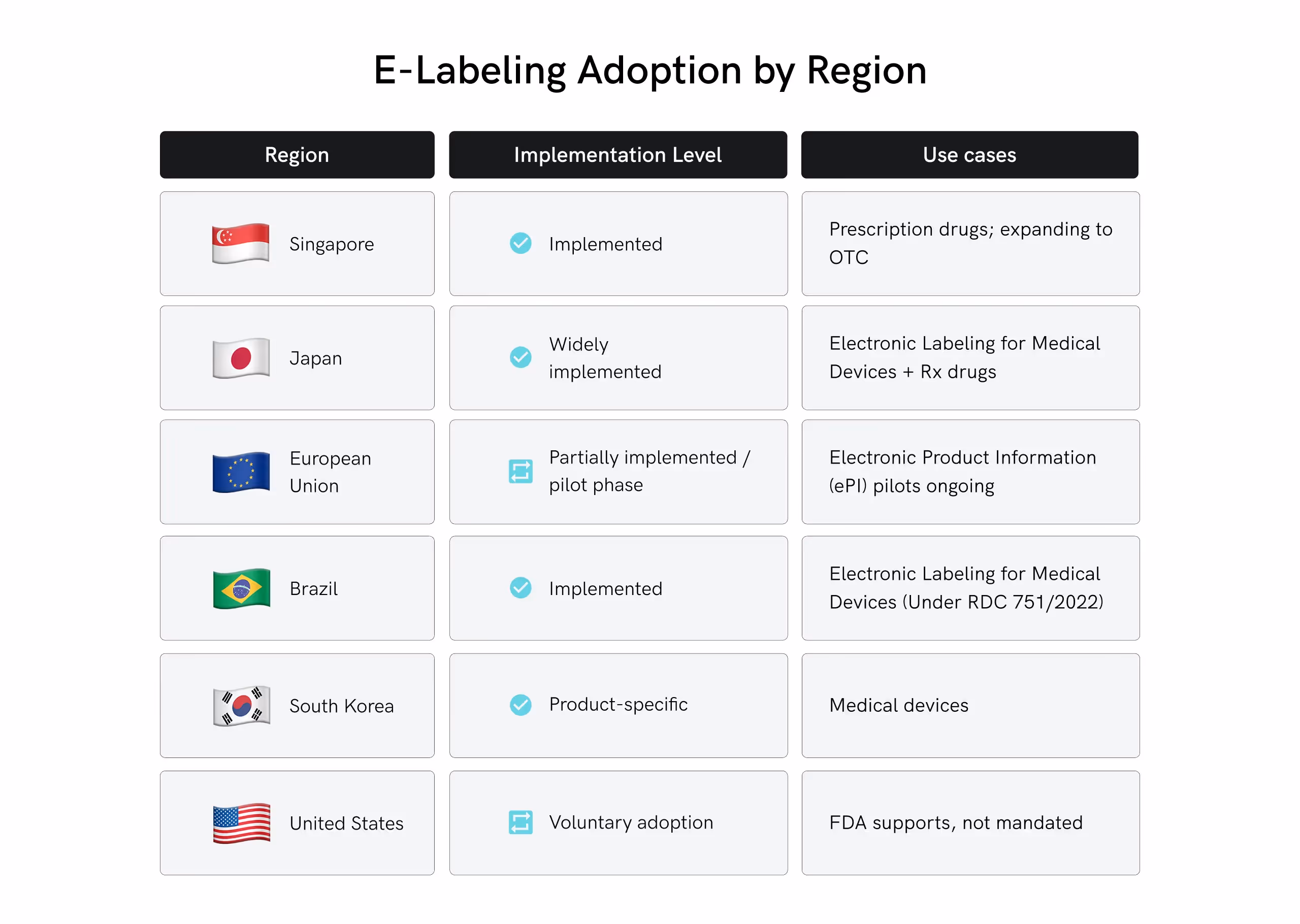 - United States: FDA e-labeling requirements are becoming more prominent as the FDA has already published guidance on electronic labeling for prescription drugs and devices. While not mandatory, the trend toward voluntary adoption is growing.