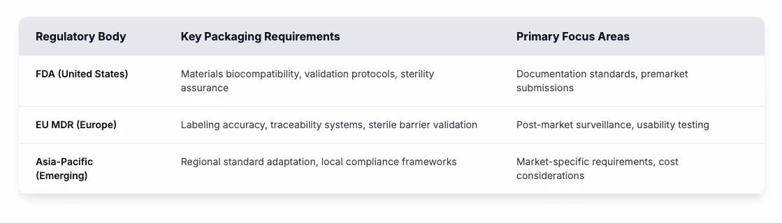 Regulatory demands shape everything about medical device packaging development. FDA standards, EU MDR requirements, and Asia-Pacific frameworks are all pushing packaging toward stronger materials and stricter controls on labeling and traceability across the healthcare industry. These expectations influence packaging decisions before materials get selected and continue through final validation testing.