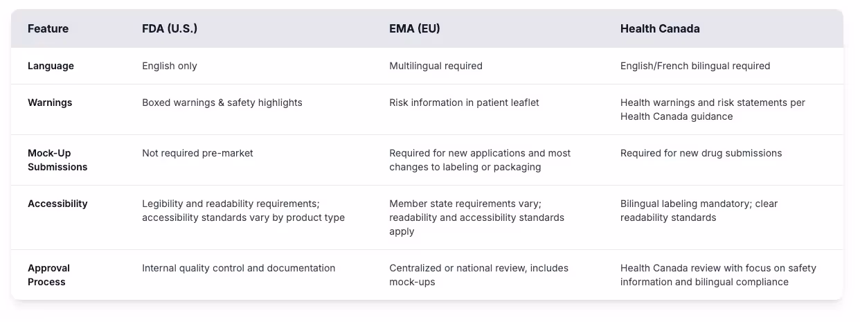 Regulatory bodies such as the FDA, EMA, MHRA, and Health Canada all have different expectations for packaging artwork. From black box warnings to layout formats, the details matter. Non-compliance consequences extend beyond recalls to include warning letters, consent decrees, fines, and facility restrictions that can halt operations.