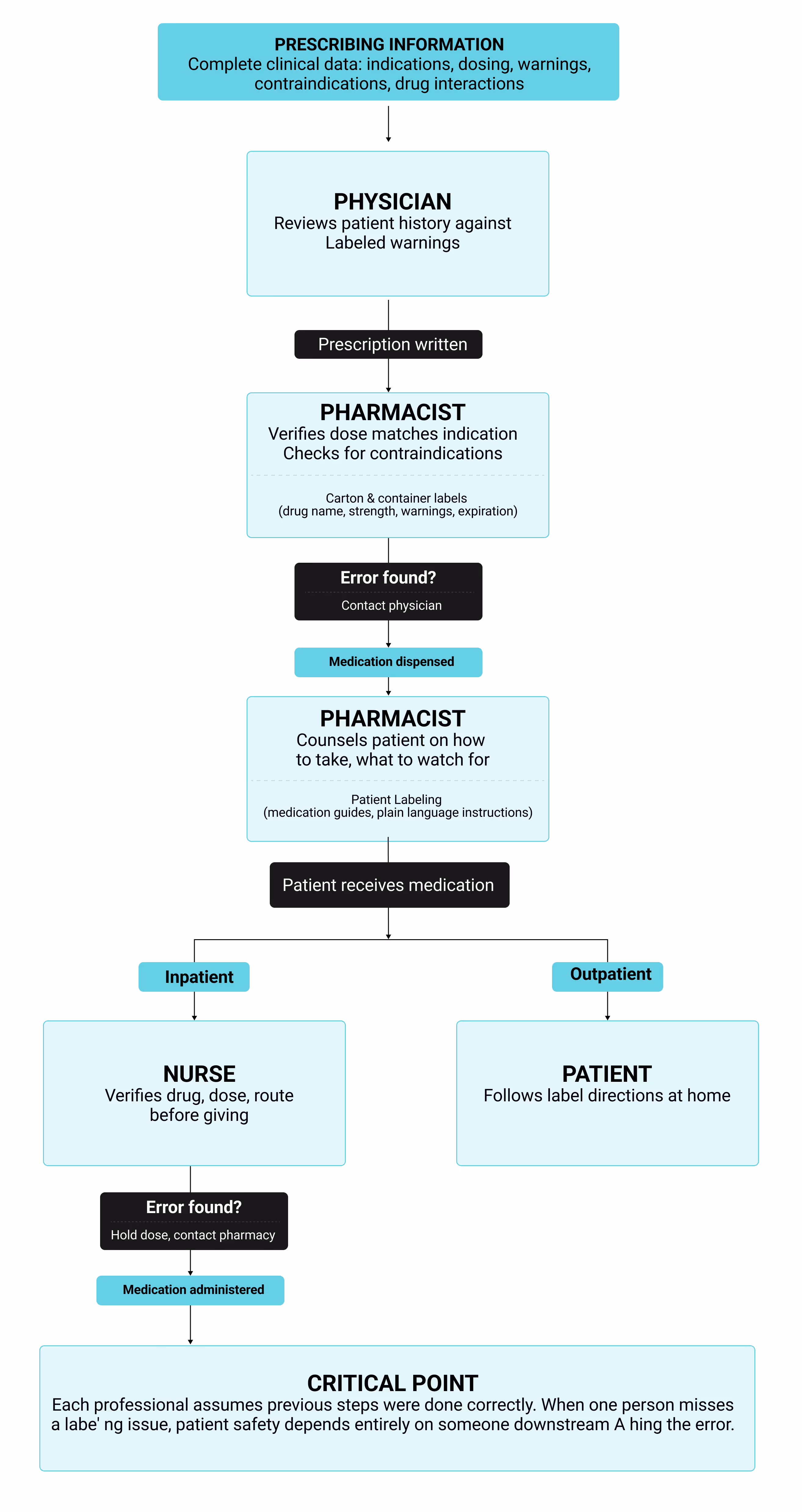 Prescribing information in a pharmacy database is useless unless it guides decisions at every step of care. That means physicians check contraindications before writing an order, pharmacists confirm the dose against labeled indications, and nurses read the vial before preparing the medication. Understanding how labeling moves through the medication use process reveals where vulnerabilities exist. Each professional relies on different labeling formats at different decision points, creating a chain of verification steps that only works when every link holds. The flowchart below maps these touchpoints and shows how errors that slip past one checkpoint become the next person's problem to catch: