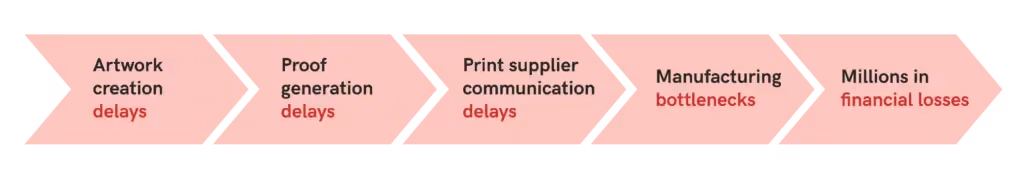 This in turn delayed new artwork creation, proof generation, print and packaging supplier communications, and ultimately: manufacturing lines, leading to significant financial losses worth millions.