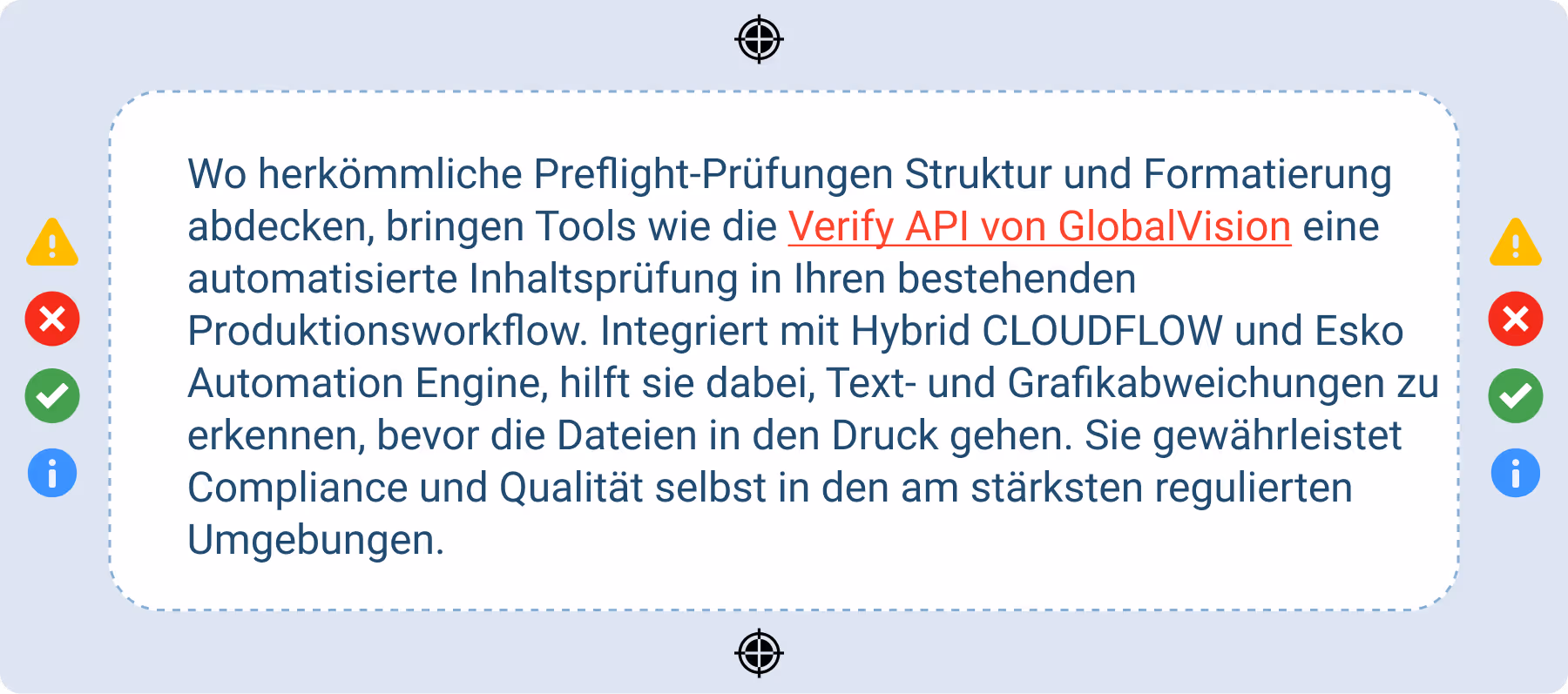 Traditional preflight tools check for structural and technical issues, while GlobalVision’s VerifyAPI focuses on content and visual accuracy. It catches differences across visual elements, from text to graphics to layout, before they reach production. Together, they give teams complete confidence in every file. Try it today.