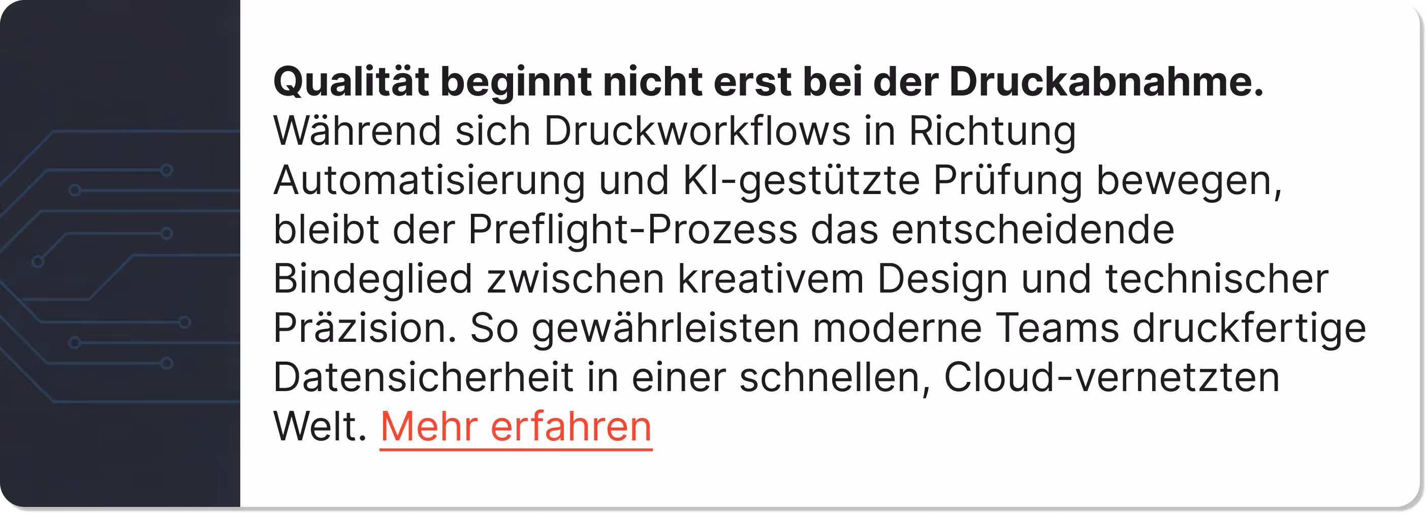 Preflight wird intelligenter. Moderne Preflight-Systeme lernen aus vergangenen Projekten und erkennen Muster, die auf Probleme hinweisen, selbst wenn einzelne Elemente technisch gesehen die Spezifikationen erfüllen. Dieses kontextuelle Bewusstsein erkennt Probleme, bei denen herkömmliche, regelbasierte Prüffehler vollständig erkannt werden.