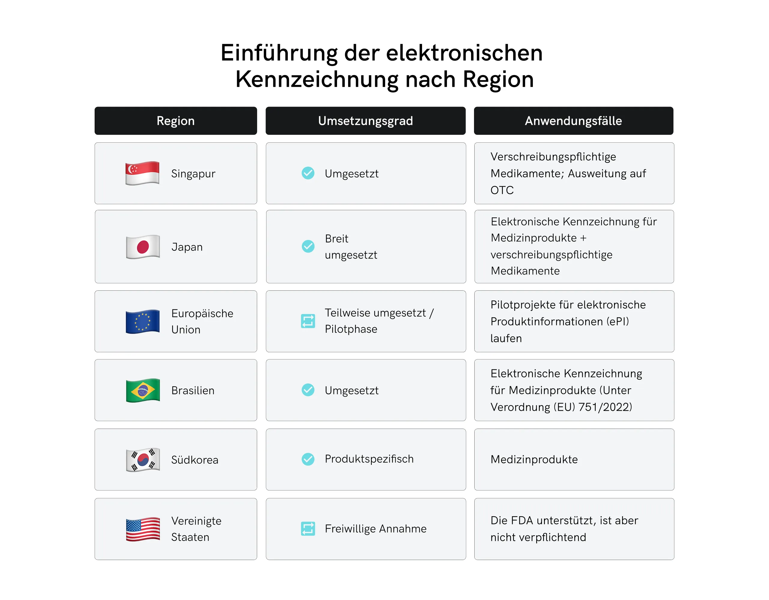 - Europäische Union: Die EMA macht weiter Unterstützung von Initiativen zur elektronischen Produktinformation (ePI). Mehrere Mitgliedstaaten haben Pilotprogramme verabschiedet, und es laufen Diskussionen zur Schaffung eines EU-weit harmonisierten Ansatzes, insbesondere der EU-MDR-Anforderungen zur elektronischen Kennzeichnung.
