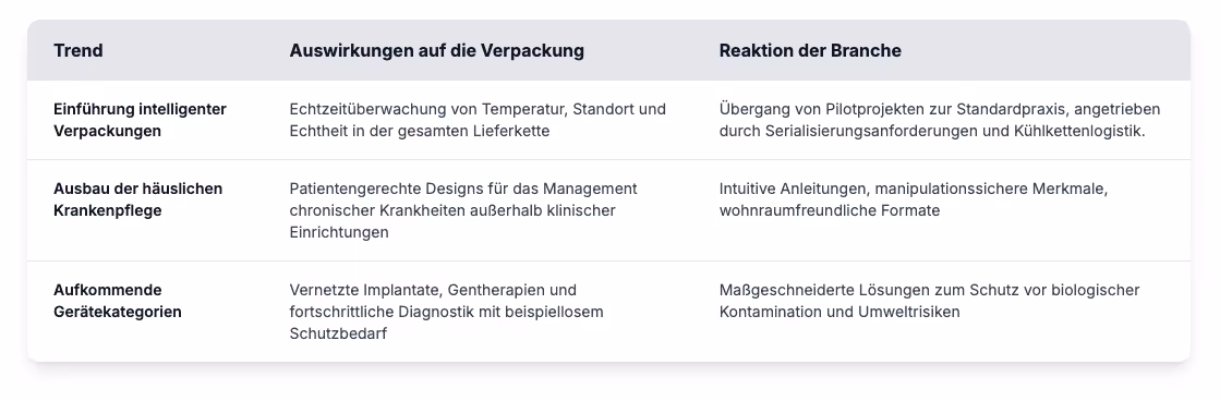 Die Nachfrage steigt an allen Fronten. Die alternde Bevölkerung in den Industrieländern benötigt mehr medizinische Interventionen, von Routinediagnosen bis hin zu komplexen Operationen. Die Schwellenländer entwickeln immer noch die Gesundheitsinfrastruktur, was die Nachfrage nach kostengünstigen Verpackungslösungen ankurbelt, die die Patientensicherheit gewährleisten. Gleichzeitig verschärfen sich die regulatorischen Erwartungen weiter. Die FDA-Vorschriften, die MDR-Anforderungen der EU und die sich entwickelnden Rahmenbedingungen für den asiatisch-pazifischen Raum verleihen dem Schutz, der Kennzeichnung und der Rückverfolgbarkeit in der gesamten Gesundheitsbranche einen neuen Stellenwert. Diese strengeren Anforderungen treiben tatsächlich Innovationen in der Materialwissenschaft sowie intelligente Verpackungstechnologien und eine verbesserte Transparenz der Lieferkette voran.