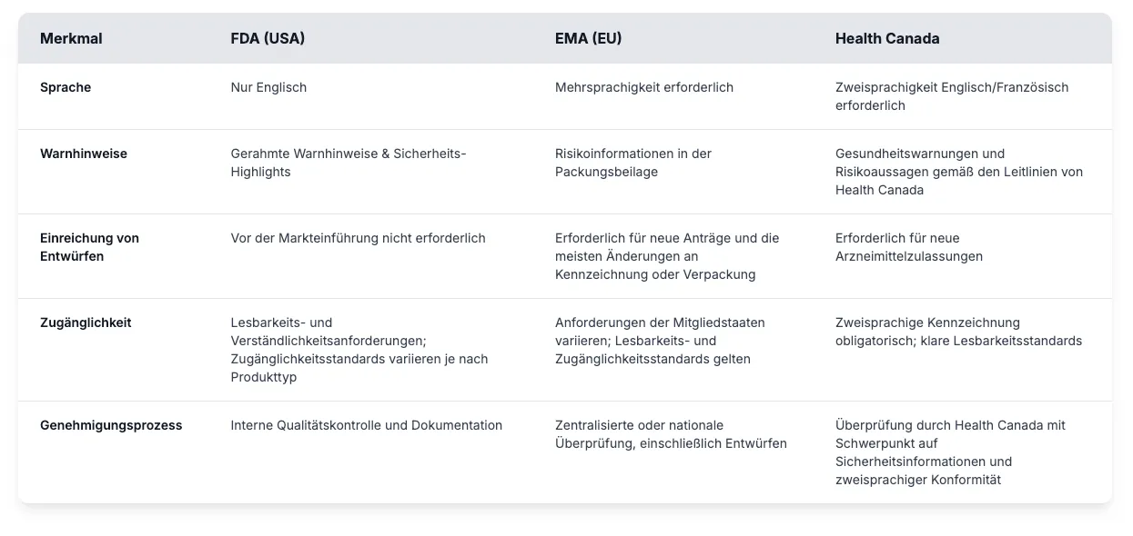 Aufsichtsbehörden wie die FDA, EMA, MHRA und Health Canada haben alle unterschiedliche Erwartungen an Verpackungskunstwerke. Von Blackbox-Warnungen bis hin zu Layoutformaten — die Details sind wichtig. Die Folgen von Verstößen gehen über Rückrufe hinaus und umfassen auch Warnschreiben, Einwilligungsverfügungen, Bußgelder und Betriebseinschränkungen, die den Betrieb zum Erliegen bringen können.