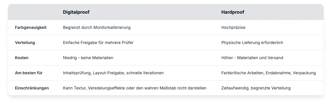 Die Kundenschulung macht den Unterschied zwischen reibungslosen Genehmigungen und endlosen Überarbeitungen. Machen Sie den Kunden klar, dass digitale Proofs hervorragend geeignet sind, um Inhalte und Layoutprobleme schnell zu erkennen, während harte Proofs die wahren Farben zeigen, die sie im Endprodukt sehen werden.