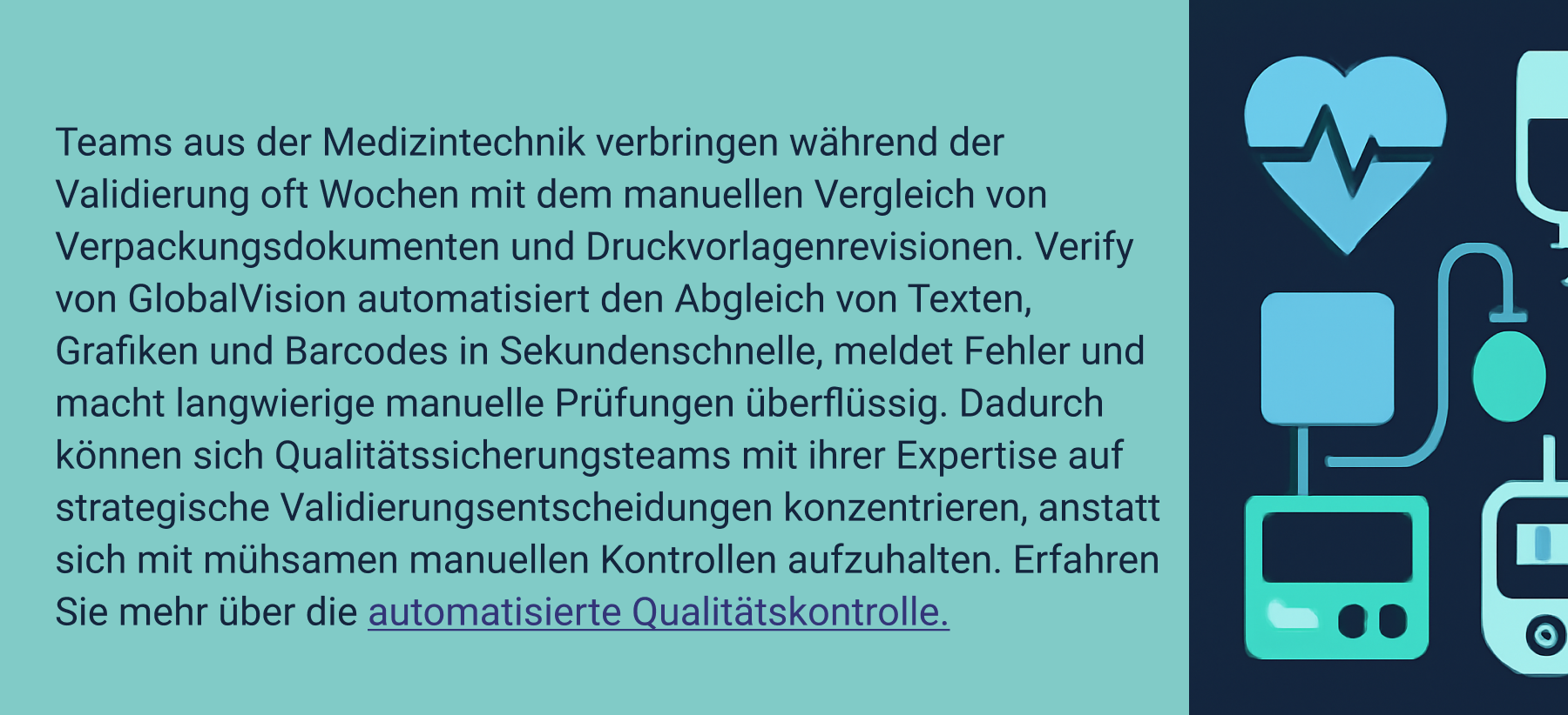 Verify von GlobalVision beschleunigt die Validierung von Verpackungen, indem die Prüfung von Dokumenten und Kunstwerken automatisiert wird, sodass die Teams sich auf die Einhaltung der Vorschriften verlassen können, ohne dass dies zu Verzögerungen führt.