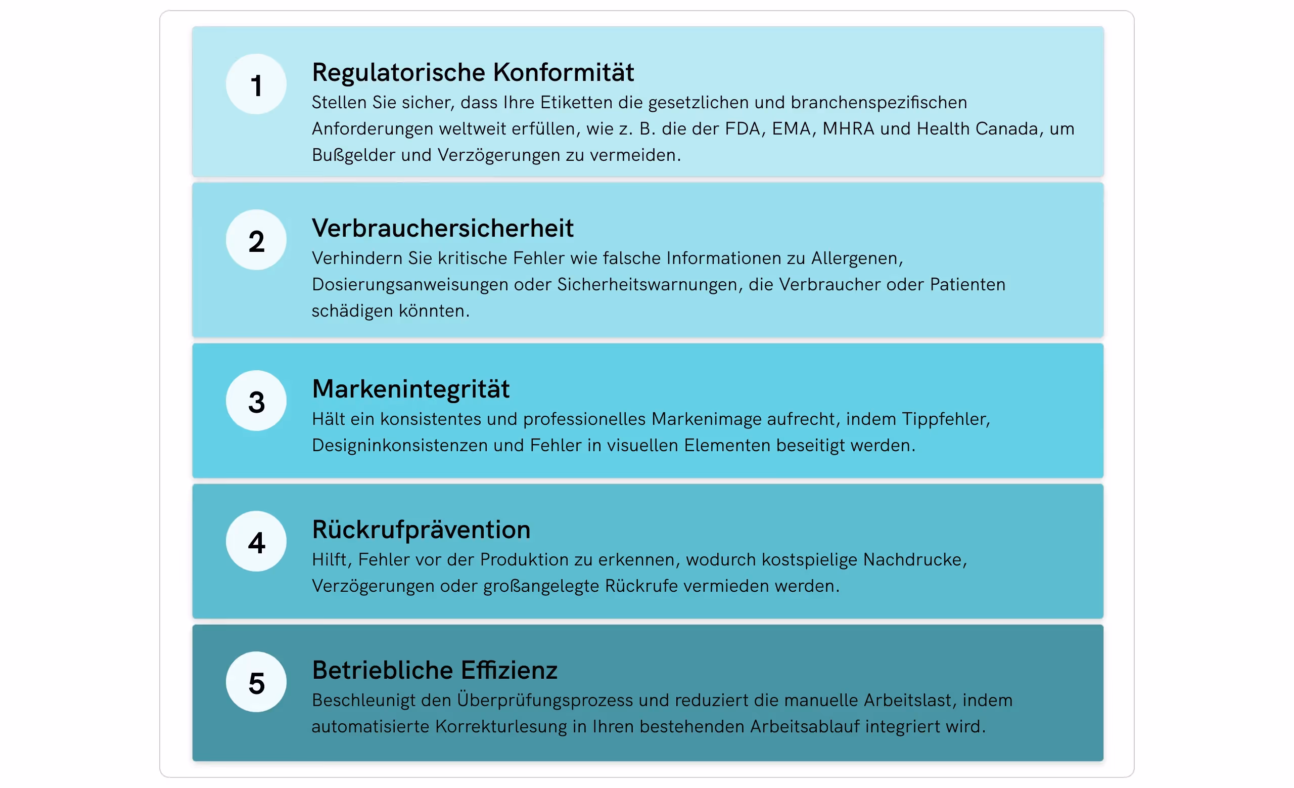 Ein einziges Versehen, z. B. ein Tippfehler in einer Warnung oder eine irreführende Behauptung, kann zu Verstößen gegen gesetzliche Vorschriften, Produktrückrufe oder Risiken für die Verbrauchersicherheit führen. Neben der Einhaltung gesetzlicher Vorschriften stärken Konsistenz und Genauigkeit auf der Verpackung das Markenvertrauen.