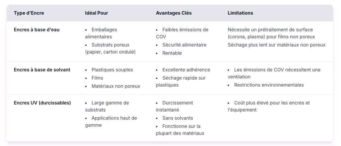 Les encres d'impression flexographique doivent sécher rapidement tout en adhérant à divers supports, en faisant correspondre les couleurs de manière uniforme et en respectant des normes environnementales de plus en plus strictes. Trois familles d'encres principales couvrent la plupart des applications, chacune étant la plus adaptée à des matériaux spécifiques :