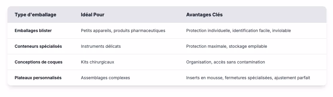 L'industrie continue cependant d'évoluer. Les solutions d'emballage durables sont devenues une priorité, les organisations de santé trouvant un équilibre entre les objectifs environnementaux et la sécurité des patients. Des entreprises telles que Sonoco Products Company stimulent l'innovation dans ce domaine en développant des matériaux biodégradables qui maintiennent des barrières stériles aux côtés des plastiques recyclables à usage médical. D'autres fabricants réduisent le volume des emballages pour réduire les déchets. Mais la durabilité ne peut pas compromettre la protection pendant des mois de stockage et d'expédition internationale. C'est pourquoi l'innovation en matière de matériaux est plus importante que la simple réduction : échanger des matériaux sans repenser le système fonctionne rarement. Choisir les bons matériaux d'emballage se complique rapidement en fonction de ce que vous protégez :