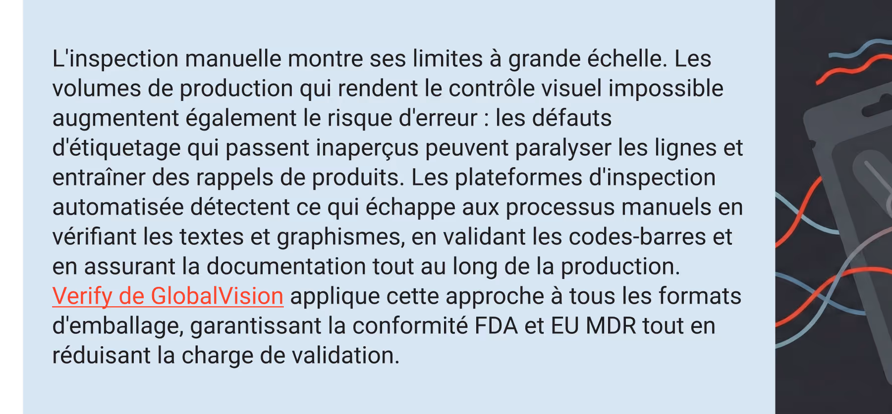 La vérification de GlobalVision donne aux équipes chargées de l'emballage l'assurance que chaque étiquette et chaque fichier répondent à la précision attendue par les régulateurs et sur laquelle les patients comptent.