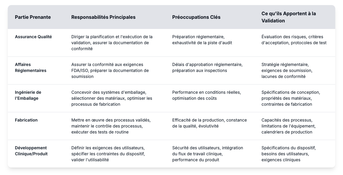 La validation est généralement menée par l'assurance qualité, mais le véritable succès dépend de la coordination interservices. De nombreux retards sont dus à une confusion quant aux rôles ou à des lacunes dans les attentes. Lorsque les groupes d'ingénierie, de réglementation et de fabrication apportent leur expertise de manière synchronisée, la validation devient bien plus efficace et fiable.