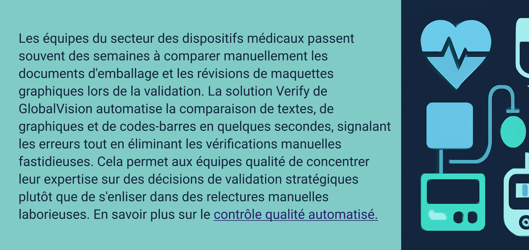 La vérification de GlobalVision accélère la validation des emballages en automatisant l'inspection des documents et des illustrations, ce qui permet aux équipes de se conformer en toute confiance sans les ralentir.