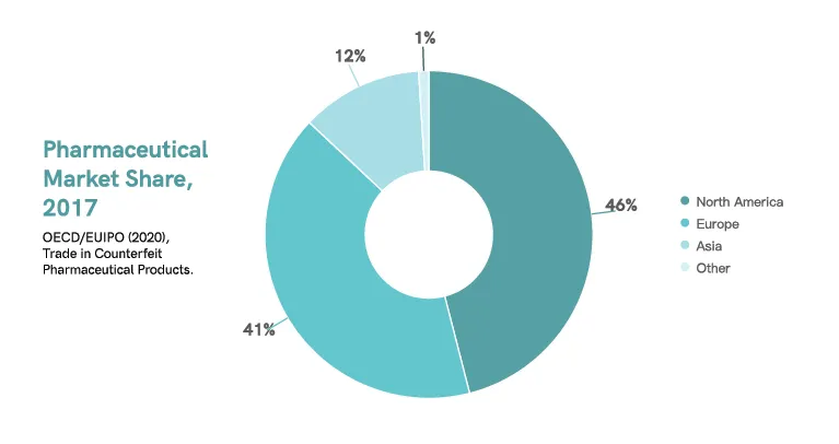Selon une étude réalisée en 2017, l'Amérique du Nord a saturé environ 46 % du marché pharmaceutique mondial, suivie de l'Europe avec environ 41 % et de l'Asie avec environ 12 %.9 Actuellement, les États-Unis et l'Europe dominent le marché pharmaceutique mondial5.