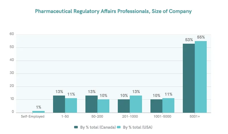 Au Canada et aux États-Unis, la plupart des professionnels de la réglementation sont employés par des entreprises, entre 53 et 55 % d'entre eux travaillant pour des organisations comptant plus de 5 000 employés.5 Cela indique que l'échantillon de notre enquête est une représentation adéquate de la population cible.