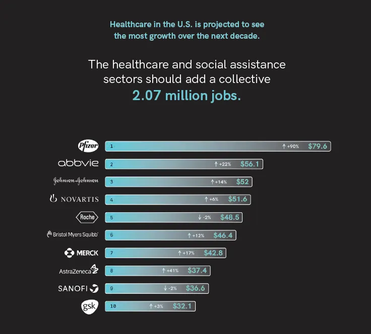 Rien qu'aux États-Unis, les soins de santé devraient connaître la plus forte croissance au cours de la prochaine décennie et les secteurs de l'aide sociale devraient créer collectivement 2,07 millions d'emplois sur le marché4.
