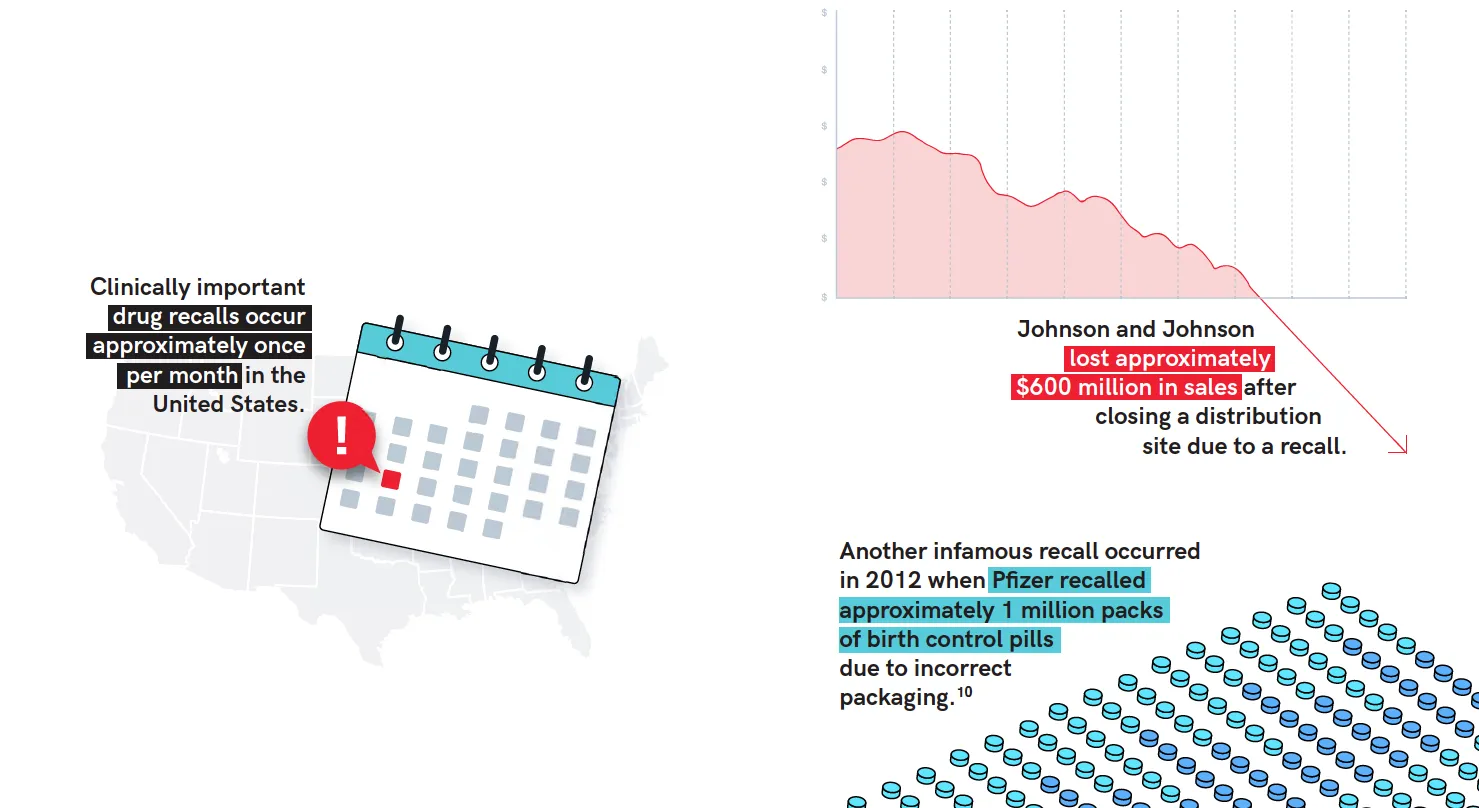 Il est également important de noter que les rappels ont un impact financier important sur le système de santé et qu'ils sont beaucoup plus fréquents qu'on ne l'imagine. Les rappels de médicaments importants sur le plan clinique ont lieu environ une fois par mois aux États-Unis. Pour se faire une idée de l'ampleur de ces impacts financiers, Johnson and Johnson a perdu environ 600 millions de dollars de ventes après la fermeture d'un site de distribution en raison d'un rappel9.