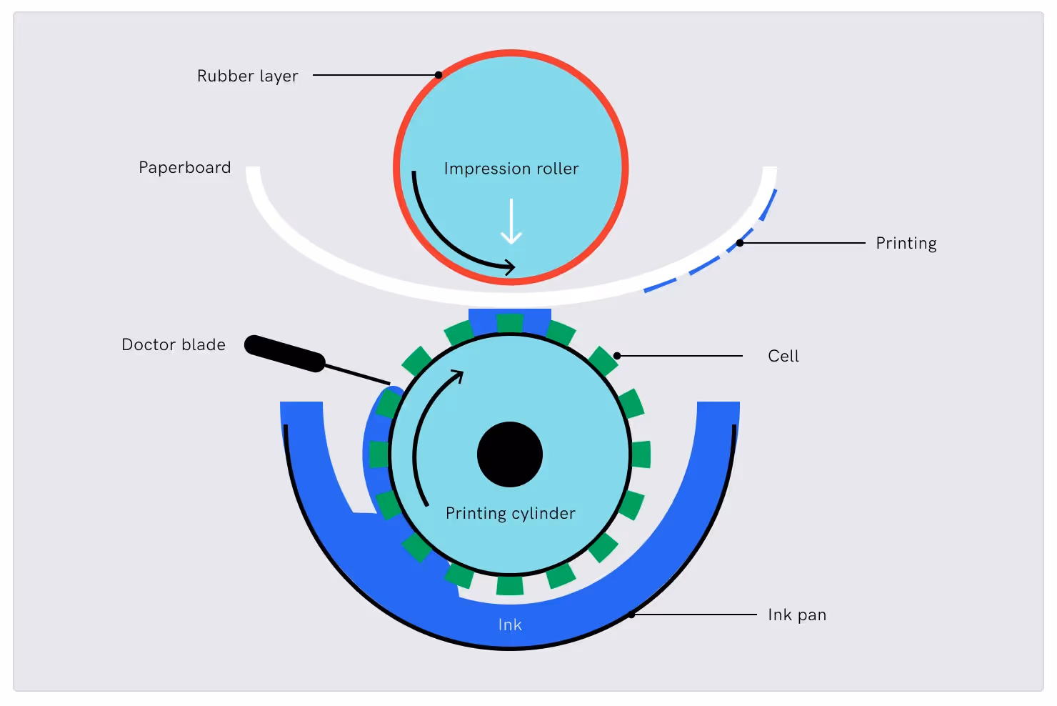 - Ink Application: The cylinder is dipped in ink, and a blade removes excess ink, leaving ink only in the etched cells.