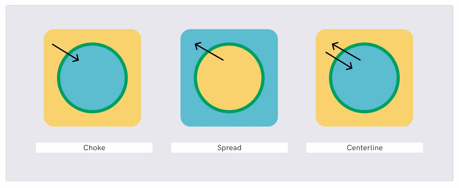 - A lighter color slightly expands (spreads) under a darker color to prevent gaps.