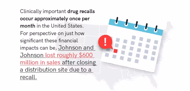 Clinically important drug recalls occur approximately once per month in the United States. For perspective on just how significant these financial impacts can be, Johnson and Johnson lost roughly $600 million in sales after closing a distribution site due to a recall.