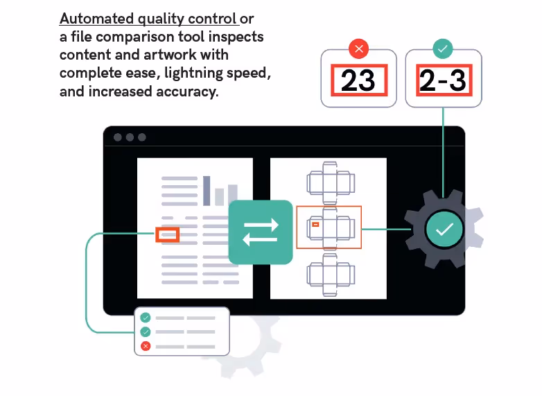 Automated quality control or a file comparison tool inspects content and artwork with complete ease, lightning speed, and increased accuracy.